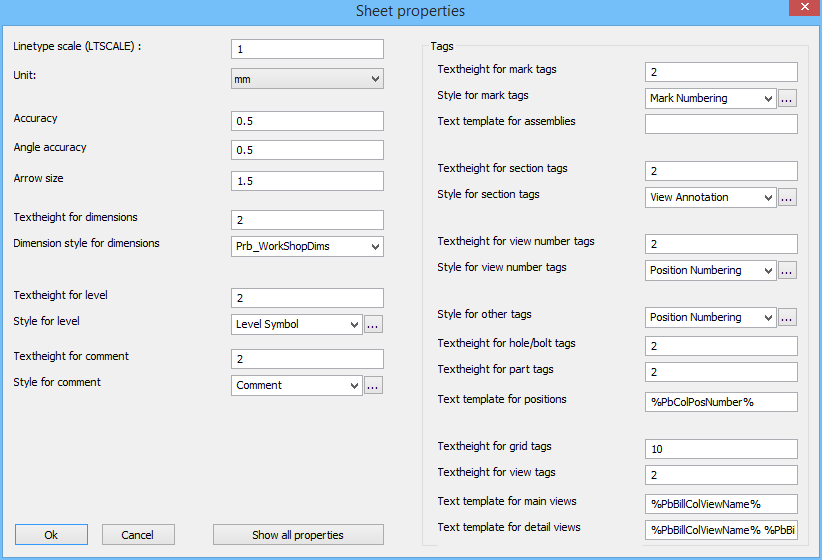 - Textheight for dimensions. The text height of all dimensions on the sheet.