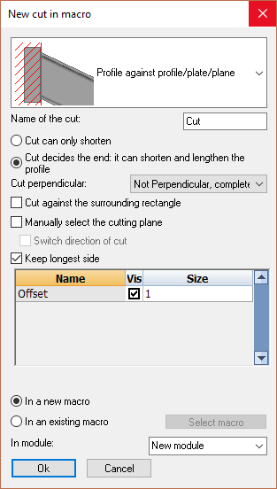 With this command, you are able to add cuts to a macro. The advantage of this is that the cut will adapt automatically if one of the base profiles of the cut changes. Also the options of the cut can always be modified after the cut has been drawn, without the cut needing to be drawn again.