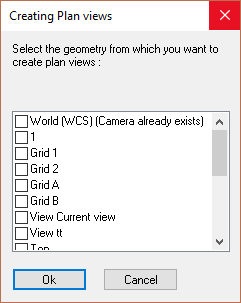 Activating this command will open the Creating Plan views dialog. Here you may select which view(s) to generate by checking one or more items in the list.