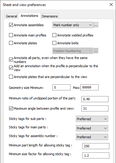 Geometry size - This options works as a filter for the annotations. Parts smaller than the minimum or larger than the maximum will not receive an annotation. The length of the axis of the parts are used for this filter.