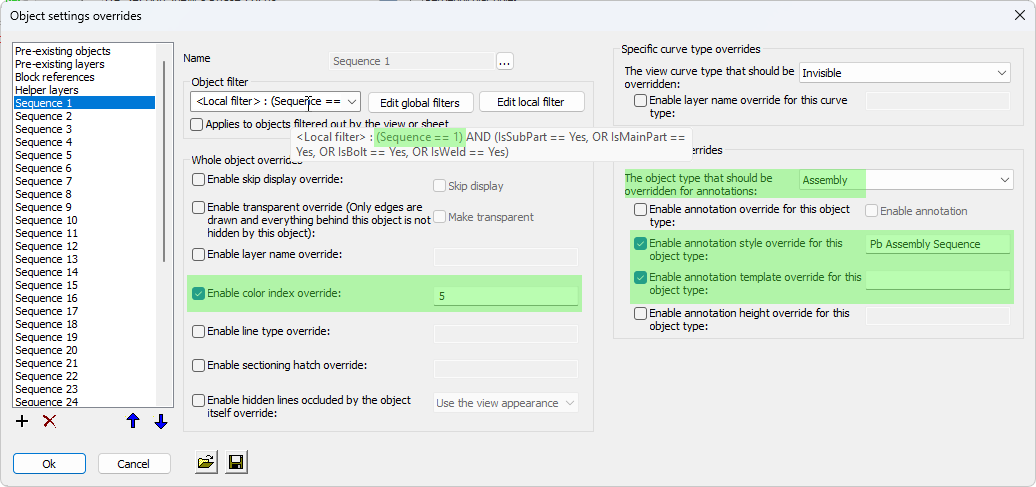Enable annotation style override - The Pb Assembly Sequence style was chosen, so all objects with this sequence will get a sequence annotation