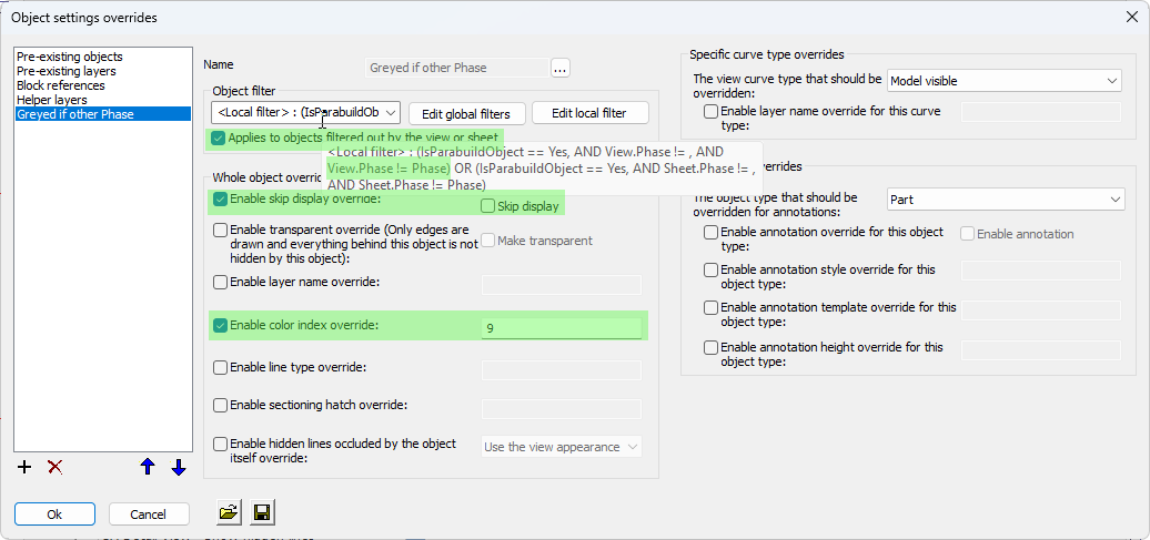 Local filter - This filter was set to apply only to Parabuild objects, but more important is the filter "View.Phase != Phase" : This means that the Phase of the object can not be the same as the phase of the view to pass this filter. The view phase is retrieved from the phase filter that was set for the view.