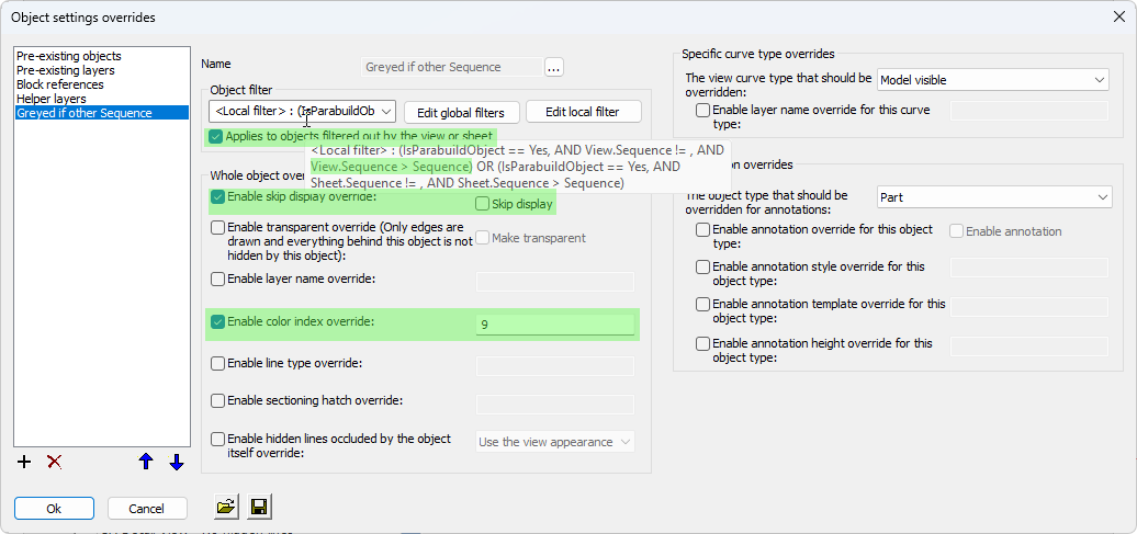 Local filter - This filter was set to apply only to Parabuild objects, but more important is the filter "View.Sequence > Sequence" : This means that the Sequence of the object needs to be smaller than the sequence of the view. The view sequence is retrieved from the sequence filter that was set for the view.