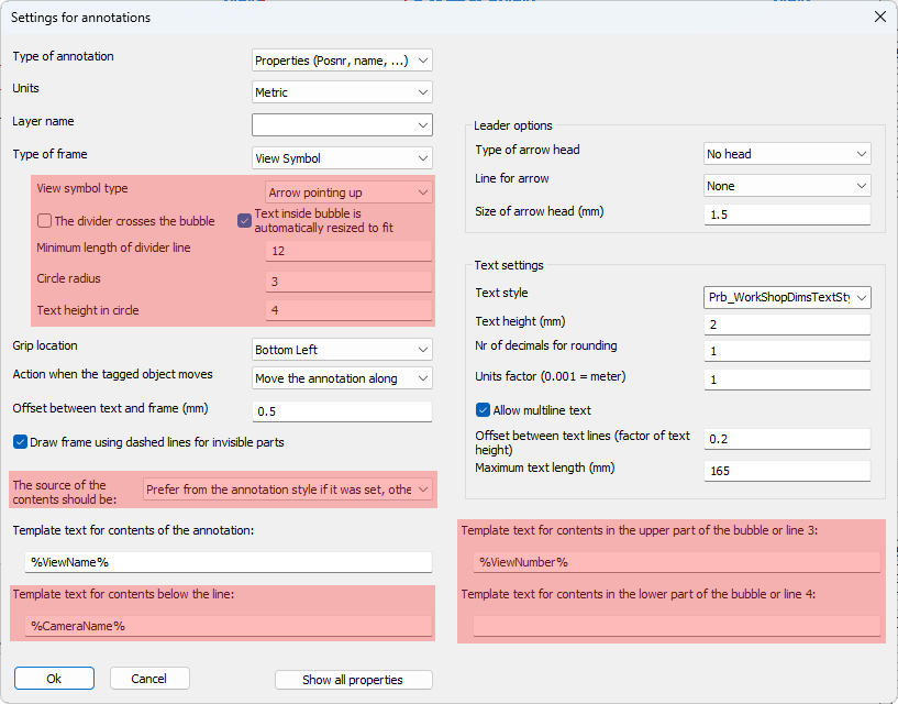 - Text height in circle - Choose the default text height of the text inside the bubble here (paper units)