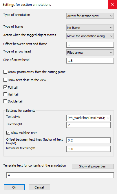 An example could be an annotation touching a dimension. Usually, the annotation would not depict properties of the dimension but rather properties of the part that is dimensioned. - Arrow for section view - This type has some unique properties that only apply to section annotations. A section annotation is used to depict the viewing direction and location of a section view. For more about the options, see below.