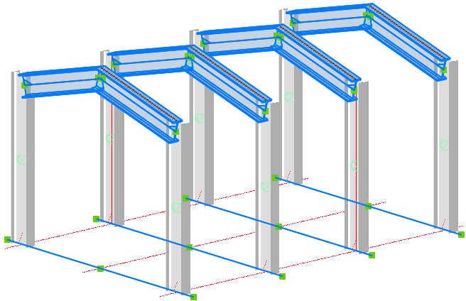 In this example the blue rafters are drawn automatically after selecting the 4 blue grid lines.
