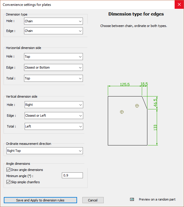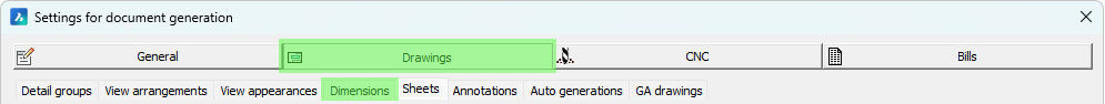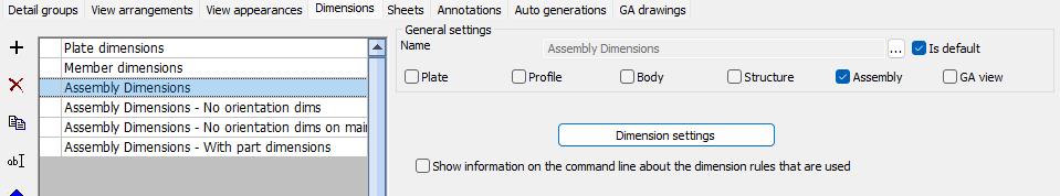 The General settings determines which part and assembly types each dimensions entry is intended for. This will not be used as a filter for the sheet generation but it will be used by the dialog box to determine which detail groups and GA drawings can utilize these named settings.