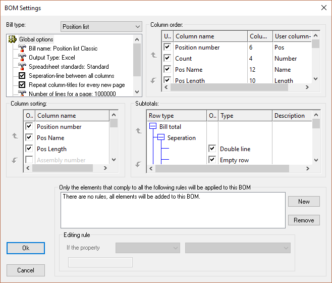 Separation: This describes the final appearance of the division between the normal elements of the part list and the sub total. All possible combinations can be selected by checking or UnChecking the boxes. The sequence can also be edited using the arrows (e.g.: first a line and then a new page).