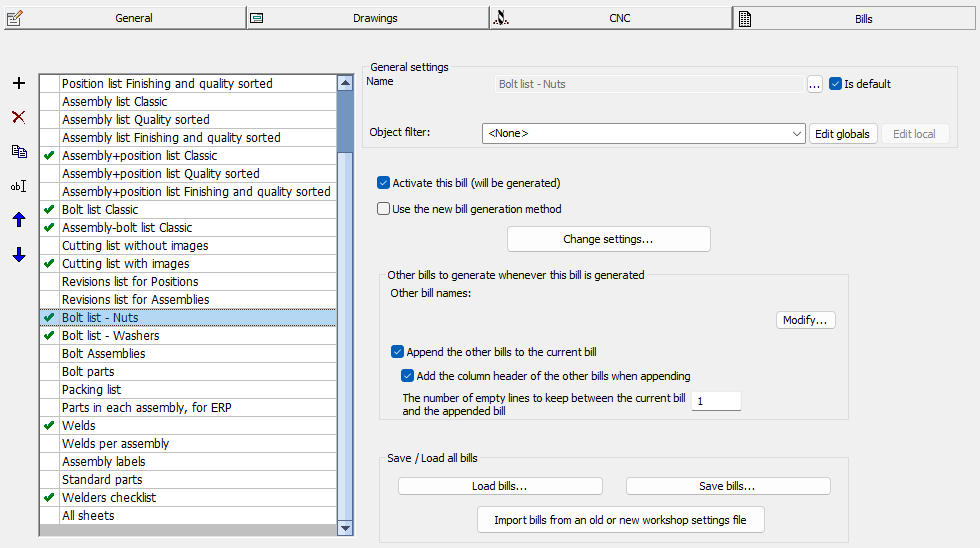 Other bill names - You can choose any other bill here, which will be generated together with this bill. This can be particularly practical when we need to merge a bolts bill with an assembly bill for a full report. See the below options for merging the bills.