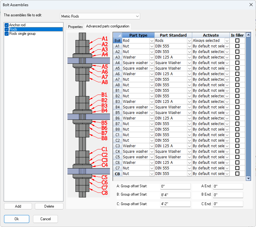 Filler washers can be enabled by default in the bolt assembly, and also individually per bolt in the properties. When enabled, Parabuild will automatically calculate the number of filler washers that are needed.