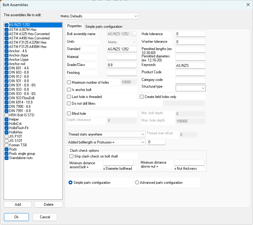 The assembly of a bolt determines the standards of the bolt, washers and nuts. We can also determine the default tolerance of the holes in the assembly.