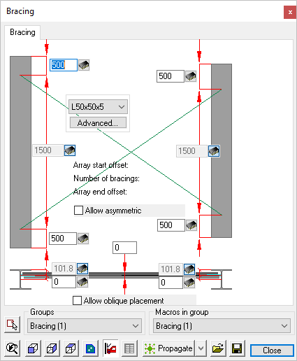Change the offset at top and at bottom. Only the values to the left apply because Parabuild has drawn a symmetric bracing. If we activate the Allow asymmetric checkbox, the values to the right will apply too.- Change the member section by using the drop down tool.