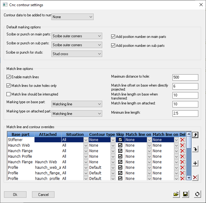 To configure the match lines and contours, use this button from within the DSTV NC Settings dialog :