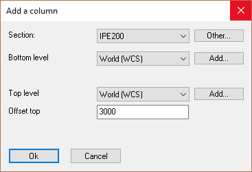 On activating this command, the Add a column dialog will appear prompting you to select the profile to be drawn, together with the top and bottom levels. If levels have already been established, they will be reflected here, additionally, you have the opportunity to create new levels or or choose an extra height offset of the column by entering a value for Offset top.