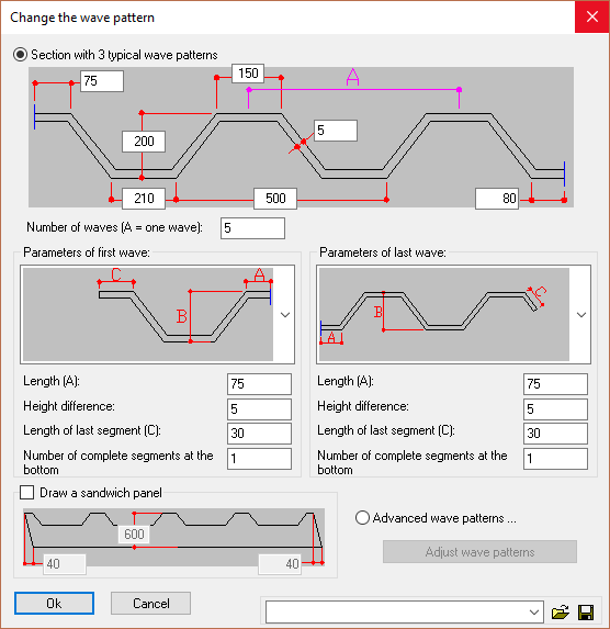 This command will draw the section of Sandwich panels or corrugated sheet metal sections as one PolyLine. This PolyLine can be used as a section to draw a profile. You can choose between 3 types of sections with help from the illustrations. The first wave, the last wave and the repeating wave in the middle.