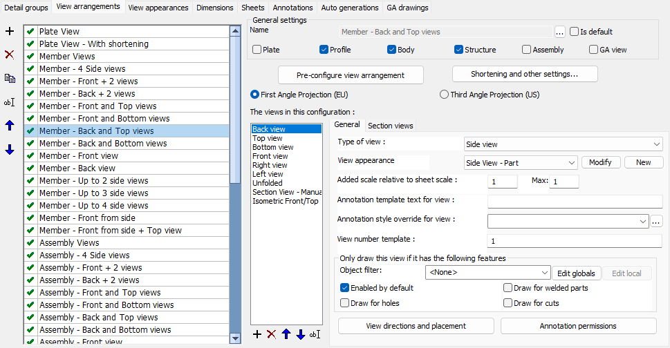 First angle projection - First angle orthographic projection is used often in the EU. Note that when you change this setting then the views in the list are modified and re-arranged, which may cause some of your manual changes to these views to be lost.