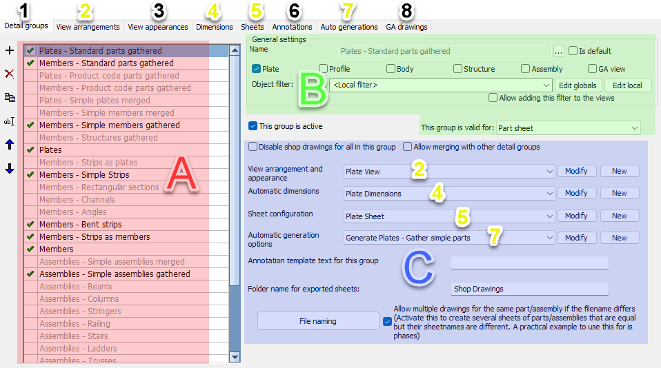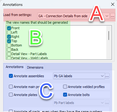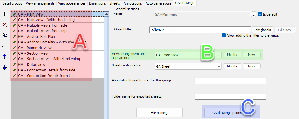 The above dialog can be fully configured with the help of the GA Drawings dialog shown below. The relations are illustrated with areas A, B and C on both dialog images.