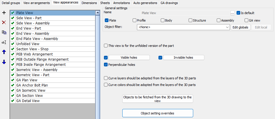 The General settings determines which part and assembly types view arrangement entry is intended. This will not be used as a filter for the sheet generation but it will be used by the dialog box to determine which detail groups and GA drawings can utilize these named settings.