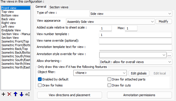 Annotation template text for view - Use this template text to add an annotation underneath that view for describing the view. This is by default used for endplate and section views in assemblies, or for GA views. A general annotation for the whole part or assembly can be set in the Detail groups tab.