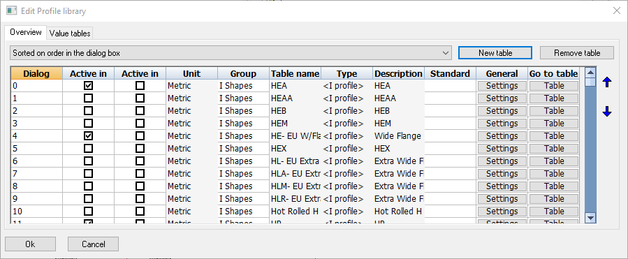 - I/O - You can deactivate the individual profile so that it becomes invisible in the Select profile dialog box without having to remove it. Parabuild will nevertheless recognize the profile if it was drawn in a drawing. Therefore if you deactivate the profile here it only has influence on the Select profile dialog box.
