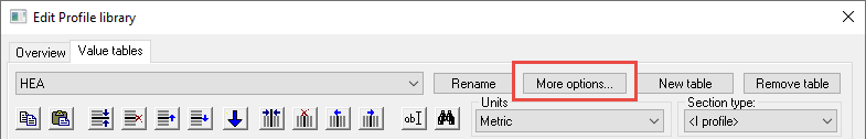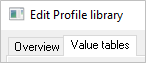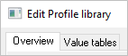 Selecting this tool will bring up the Edit profile library dialog. At the top left of the dialog there are 2 tabs: Overview and Value tables