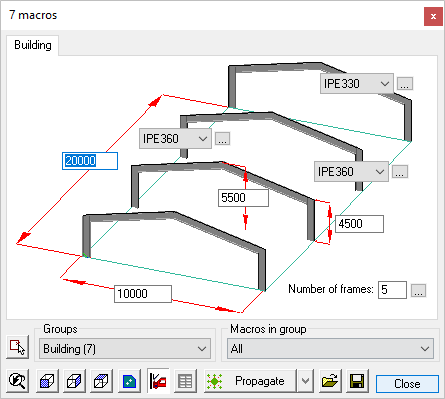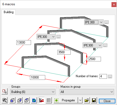 Here, you are able to fix the height, roof height, width, number of bays, and the steel section sizes.