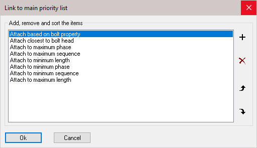With this priority list you can influence the automatic assignment of reference assembly of all bolts. The list is ordered according to priority. You can add, delete, and sort all items in the list.
