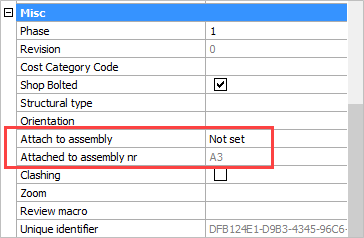 The property Attached to assembly nr can't be changed. This will indicate which assembly the bolt is currently attached to. It is the assembly that was effectively chosen by the either the main priority list or by the Attach to assembly property if it has been set.