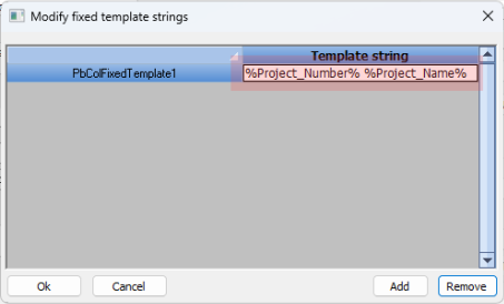 Below in red an example template string where the project number and project name are configured as contents for fixed template column 1 :