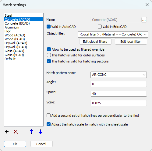 Valid in AutoCAD/BricsCAD - These 2 filters allow us to make the hatch setting available in BricsCAD only, AutoCAD only, or both. The reason for having this is because the hatch names for concrete, wood, drywall, and glass are different in AutoCAD vs BricsCAD.