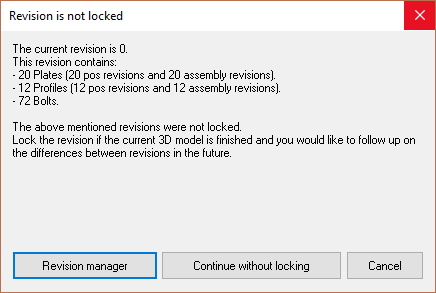 A dialog will appear to warn you that the revision is not locked - here you have the option to lock the revision using the Revision manager or to continue without locking. It is safe to continue without locking.