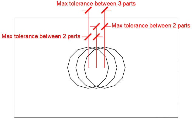 The below illustration shows the difference between the tolerance of 2 parts and the total tolerance of 3 parts or more.