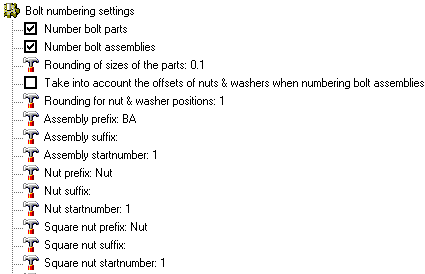 Take into account the offsets of nuts & washers when numbering bolt assemblies - When this is enabled then not just the bolt parts are used to check whether assemblies are equal, but also the position of the bolt parts on the shaft of the bolt
