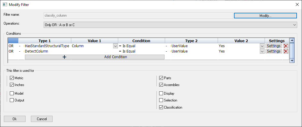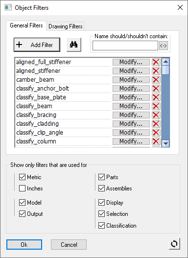 - Display / Selection / Classification - Whether the filter should be for user interface display tools, for the selection of objects, or for the classification of structural types (or a combination of these)