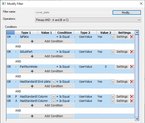 Conditions - This list contains a row per condition. It lists the conditions that need to pass in order for the filter to pass. Use the Add condition button below each group to add conditions.