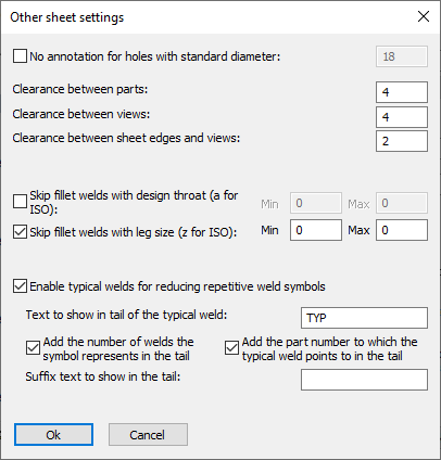 Enable typical welds for reducing repetitive weld symbols - Typical welds are identified as welds with the same sizes and type that are also welding together geometries with the same part numbers. By enabling this identical welds can be represented by a single typical weld symbol with an added automatically generated tail description.
