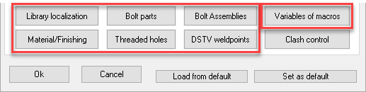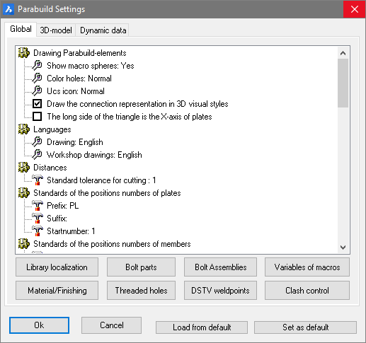 All new 3D drawings that you create starting from a template drawing will assume these defaults. - Load from default will read the defaults that have been stored in \Parabuild\defset.dat and will apply all the values to the current 3D drawing.