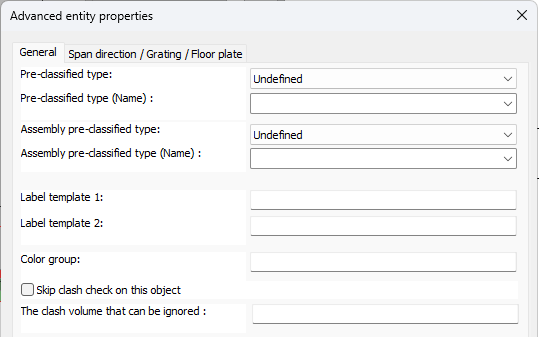This property is accessible from the advanced properties dialog box. This property is available to macros, arrays, bolts, plates, profiles, structures, and volumes. - Skip clash check on this object - When this option is enabled then the object will not take part in the clash checking routine. Care should be taken when using this function because failure to erect the structure may occur if clashing elements are allowed. This property was only created for cases like flat bars or round bars being used for bracings. These well bend when erected but drawing this bend in the 3D model just to prevent the clash detection is quite cumbersome.