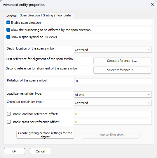 The span direction / grating / floor data properties on the separate tab are explained below :