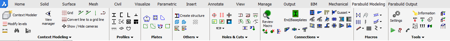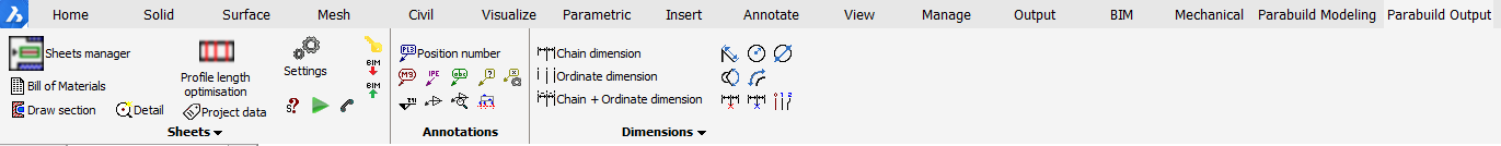 Parabuild has 2 main tabs - Parabuild modeling, which contains all the 3D modeling commands, and Parabuild output, which contains all 2D commands including generation of 2D sheets and dimensioning.