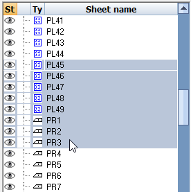 To do this you first need to select the first sheet, press and hold the SHIFT key, and then select the last sheet : all sheets within the chosen sheets will be selected. Now click the right mouse button to perform an action on the sheets.