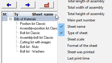 The Top list contains all the 2D sheets created, and also all available bill of materials. Right clicking a 2D sheet in this list will bring up a series of available tools.