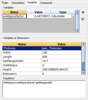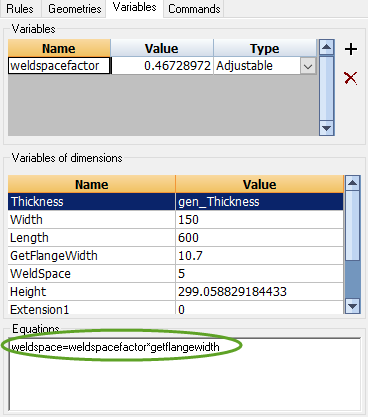 In the above example, the value of the variable weldspacefactor is calculated by the equation weldspace=weldspacefactor*getflangewidth