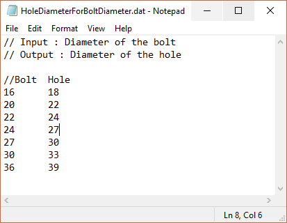The contents of the file HoleDiameterForBoltDiameter.dat looks like this: