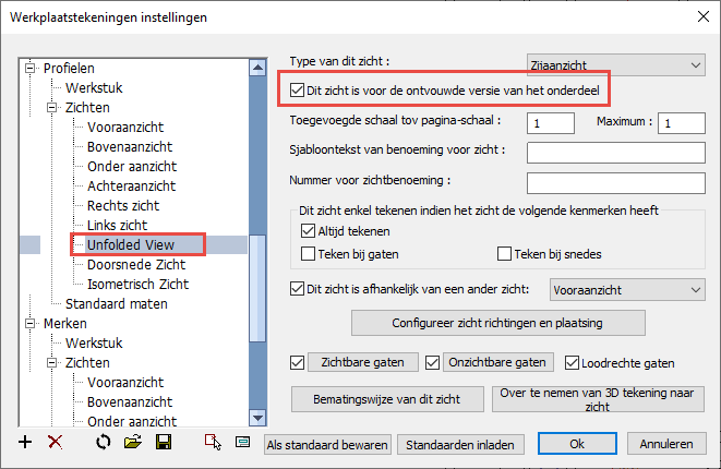 Als u in plaats daarvan uw oude werkplaatstekeninginstellingen wilt behouden, dan moet u een nieuw zijaanzicht toevoegen en deze optie ervoor activeren. Het weergavetype moet Zijaanzicht zijn. - De volgende nieuwe Dstv-opties specifiek voor het uitvouwen zijn nu beschikbaar :
