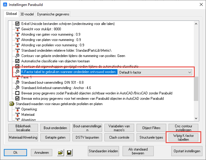 - In het dialoogvenster Parabuild globale instellingen is er een optie om te kiezen welke K-factortabel moet worden gebruikt :