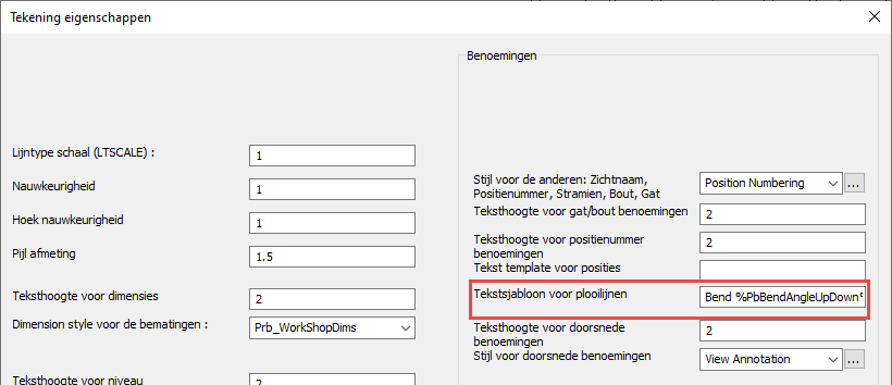 Tekstsjabloon voor plooilijnen - Dit is de tekst die wordt gebruikt voor alle benoemingen voor de plooilijnen op de ontvouwde zichten. - Voor ontvouwde onderdelen zijn de volgende nieuwe eigenschappen toegevoegd.