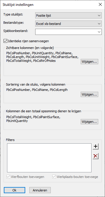 Na het activeren van deze nieuwe generatiemethode, zullen de instellingen voor de stuklijst een ander dialoogvenster tonen:
