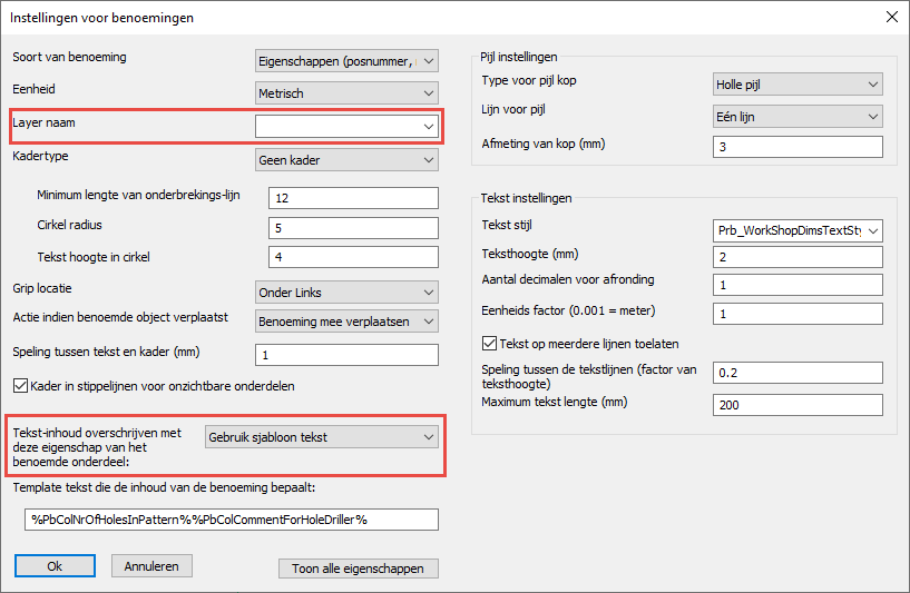 - Gebruik label template 1 or 2, of anders sjabloontekst - Als een van deze wordt gekozen, dan haalt de benoeming de eigenschap label template op uit het benoemde onderdeel.
