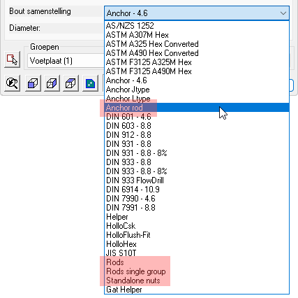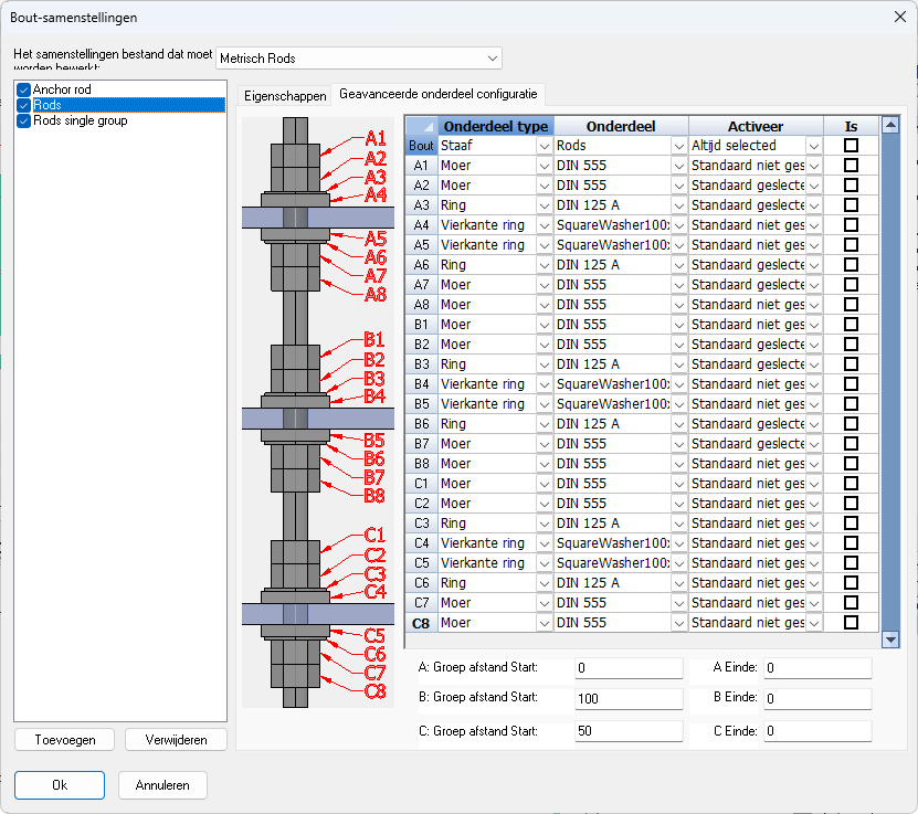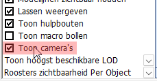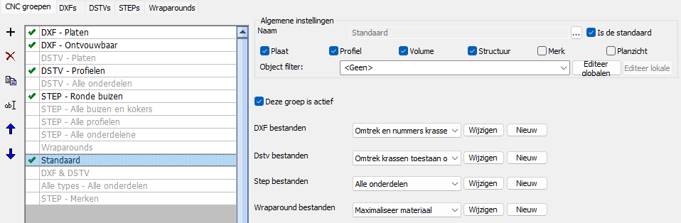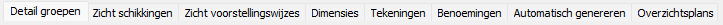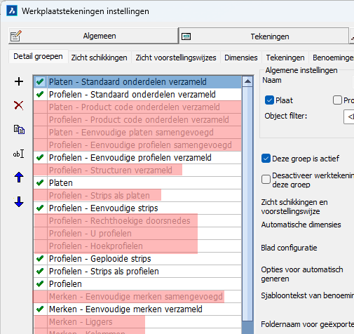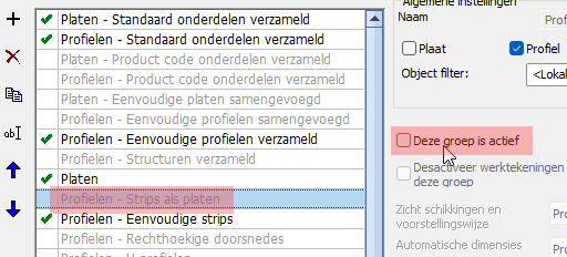 De grijs weergegeven groepen in deze lijst zijn niet actief en worden dus genegeerd bij het genereren van werktekeningen.